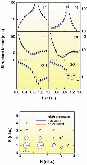 The experiments reported here were performed at the Surface Diffraction Beamline ID3 with a specially designed ultra-high-vacuum (UHV)/high pressure chamber. We collected two independent sets of crystallographic data in situ after exposing a well prepared Ni surface to 10-10 bar and 2.3 bar of CO. Figure 65 shows the results. The top panel gives the structure factors of six diffraction rods [i.e IH,K (L)]. Four have integer-valued H and K corresponding to the periodicity of the substrate lattice and two rods have fractional index arising from the CO 2x1 periodicity. The bottom panel displays the structure factors of the fractional reflections at L 0. Inspection of the figure shows immediately that the vacuum and high-pressure data sets are virtually identical and thus demonstrates that both structures are the same. Crystallographic analysis of the high pressure data through a least squares minimisation routine results in the continuous red curve in the figure. The best fit model resulted in the structural parameters shown in Table 1. The agreement with the results of Zhao et al. [1] is excellent, and additionally, our analysis reveals a slight expansion of the Ni planes, which had not been detected. The table also shows the results of the analysis of the low-pressure data, which coincide with those at high pressure.