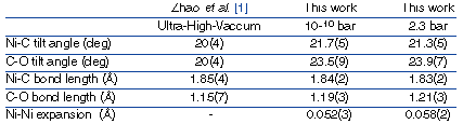 From the previous experiments we can conclude unambiguously that the equilibrium structure at room temperature of CO on Ni(110) at 2.3 bars of CO ambient pressure is the same as that obtained under UHV conditions by dosing the Ni(110) surface at saturation with 10-10 bar of CO. To our knowledge this is the first chemisorbed structure determined in detail near atmospheric pressure.