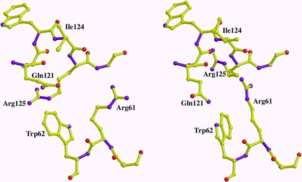 Fig. 13: A representation of a molecular contact region in lysozyme at ambient pressure (left) and at a pressure of 7 kbar (right). Several residues in the 7 kbar structure take new positions to accommodate the closer contacts induced by pressure between symmetry-related molecules in the crystal. |