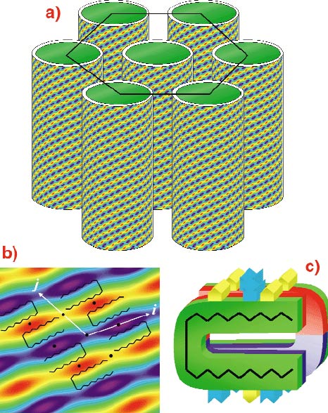 Fig. 21: a) hexagonal packing of the nanotubes, b) close-up of electron density and c) molecular conformation within the fibre. |
