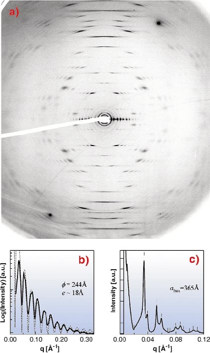 Fig. 22: (a) Fibre diffraction of the nanotube, (b) SAXS demonstrating the tube monodispersity and (c) high-resolution SAXS showing the hexagonal packing of the nanotubes. |