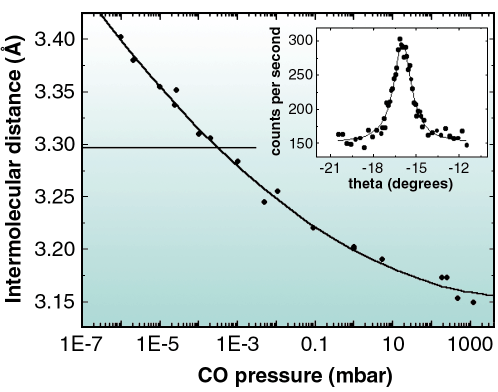 Fig. 39: Inset: rocking scan of a diffraction peak from the adsorbed CO layer taken at p = 1.2 bar in the gas phase. Main graph: dependence of the intermolecular distance of adsorbed CO on Ni(111) with the CO pressure in the chamber. The horizontal line marks the nearest neighbour distance for the ( |