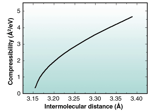 Fig. 40: Compressibility of the adsorbed CO as a function of the nearest neighbour intermolecular distance. |