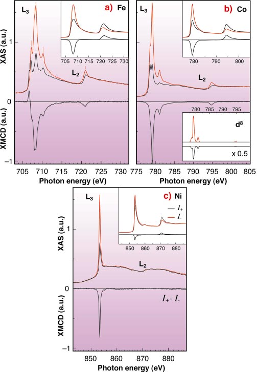 The interaction between the localised 3d states of Fe, Co, and Ni and a free-electron gas were studied by separately depositing minute amounts of the respective TM onto thick K films condensed onto a Cu(111) substrate at 10 K. The measurements were performed in magnetic fields of 7 T with the sample held at 10 K. The XAS spectra over the L2,3 edges and resulting XMCD, recorded using left and right circularly-polarised light, are shown in Figure 53. In each case the XAS and XMCD are compared with typical spectra for the bulk case. The lineshapes and relative strengths of the XAS and XMCD features are fingerprints for the atomic d-state configuration. The most striking difference between the impurity and bulk XAS and XMCD spectra is the presence of sharp multiplet features which reveal the TM atomic-like ground states due to strong 3d-electron localisation at the impurity sites. Comparison with calculated atomic spectra [1] (bottom inset in Figure 53b) indicates that a charge transfer, from the free-electron host, increases the d-valence of the TM adatoms by one electron compared to the atomic case, yielding ground states with predominantly Fe d7, Co d8, and Ni d9 character and correspondingly large magnetic moments of 6.6, 5.6, and 3.6 µB, respectively. Further, the XMCD at the L2 edge of Fe and Co has the opposite sign with respect to the bulk spectra, whereas it is zero for Ni. Application of the XMCD sum rules yields atomic-like values for L of approximately 3, 3, and 2µB, respectively, in agreement with the predictions of Hund's rules. The consistency of these results strongly supports the XMCD sum rules in the precise context of their derivation, i.e. for localised atomic states.