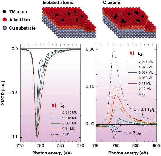 Fig. 54: XMCD spectra recorded at the (a) L3 and (b) L2 edge for Co on K/Cu(111) showing changes in the lineshape as isolated Co atoms form clusters with increased coverage. The value of L for bulk Co and isolated adatoms is also indicated. |