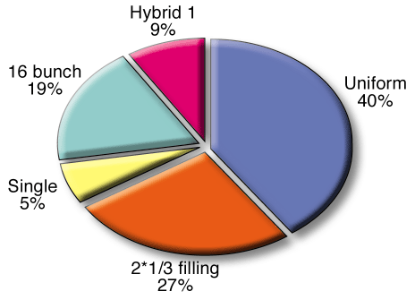 The Multibunch filling pattern which represents 67% of the total user time is now delivered mostly in uniform filling with a lifetime greater than 70 hours at 200 mA (provided that the GRAAL laser is not being powered). Despite a slightly lower lifetime, the 2*1/3 fill is still used for time-structure experiments. The remaining 33 % is shared between the 16 bunch, the single bunch and the hybrid-mode filling patterns (Figure 132).