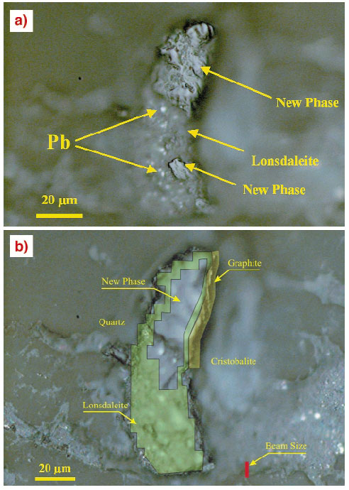 Fig. 141: (a) A Reflected light photograph focused 10 µm above the surface thus depicting the surface features of the new carbon phase with gouges and metallic lead oxide (Pb; arrow) scraped from the polishing disc; (b) Results of the synchrotron X-ray diffraction, imaging and X-ray fluorescence fine-scale mapping laid out on the microscopic photograph shown in (a) depicting the spatial settings of the various carbon phases. The figure shows also the size of the synchrotron beam (lower right, red) for comparison.