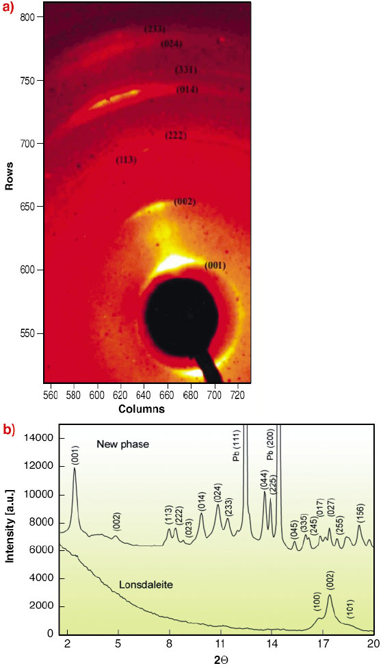 Fig. 142: X-ray diffraction pattern of the new carbon phase. (a) Diffraction picture of the new carbon polymorph demonstrating the preferred orientation due to shock-induced dynamic deformation (streaking of the diffraction spots). (b) The full X-ray patterns of the new phase along with the strongest lines of metallic lead (Pb (111) and Pb (200)) reflections (upper panel) and lonsdaleite (lower panel). The high background of continuum in the lonsdaleite pattern at 2 < 11° is due to the presence of an amorphous carbon phase.