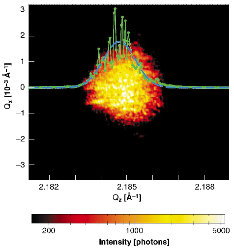 Fig. 40: Sum of two hundred CCD images of the (100) superstructure peak of Co60Ga40 at room temperature (no dynamics present). The green line shows a slice (Qx = 0) through the peak exhibiting strong intensity fluctuations. The dashed blue line indicates a Gaussian fit to the intensity distribution this would be the result of scattering with conventional, incoherent X-rays. |