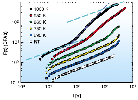 Fig. 41: Fluctuation functions F(t) from third-order DFA of speckle intensity fluctuations in the (100) superstructure peak of Co60Ga40 at increasing temperatures, double-logarithmic plot. Slope |