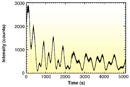 Fig. 28: Intensity oscillations of the (0,0,0.15) point as a function of time during growth of the YBa2Cu3O7-x thin film. |