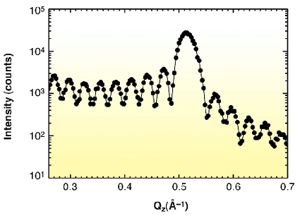 Growth was stopped several times, allowing further characterisation of the grown film. Figure 29 shows the 001 Bragg reflection of the film when it was 21.0(1) nm thick. The pronounced Kiessig fringes show that the surface is particularly smooth, which is to be expected in case of layer-by-layer growth.