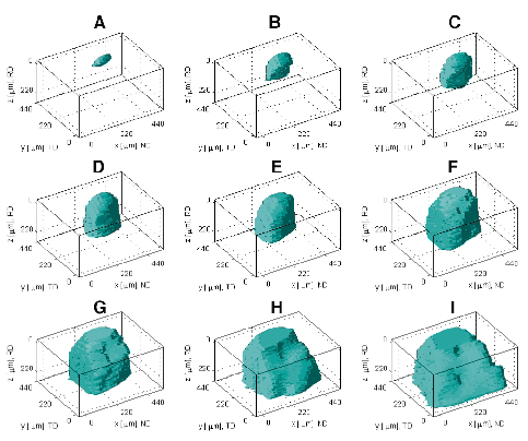 Fig. 37: Storyboard of the expansion of the grain in the sample reference system. In total 73 "snapshots" were taken during 30 hours of annealing at temperatures in the range 280°C to 310°C. The storyboard contain "snapshots" 1, 12, 17, 27, 39, 49, 59, 72 and 73 shown in figures A to I. At different times, different parts of the grain were leading in the expansion. |