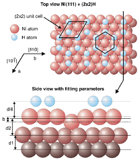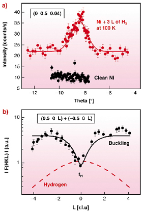 Figure 86 shows the atomic model proposed by Hammer et al. [4] for the Ultra-High Vacuum (UHV) low-temperature p(2x2) structure of H2 on Ni(111), using quantitative Low Energy Electron Diffraction (LEED). This structure consists of half a monolayer of H atoms, with the Ni atoms located below the H atoms moving upwards (buckling). Figure 87 shows a part of the SXRD dataset collected on ID03 for this same structure. This structure is a good test-case of the sensitivity of SXRD to H atoms, because there are locations in reciprocal space where the diffracted intensity is purely due to H scattering. The low-L part of the fractional order rods (Figure 87a) is one such location, for two reasons. First the buckling (z-motion of the Ni atoms) of the last Ni plane contributes only at non-zero L's (Figure 87b), and secondly, the symmetry of the model (Figure 86) forbids x-y motions of the Ni atoms. The intensity due to H scattering in Figure 87a is 20 cts/s above background, with a full-width of 1. The fitting of the structural parameters shown in Figure 86, using the SXRD data, gives values that agree well with the ones of [4]. The biggest error bar, as in the LEED study, is on the z-position of the H atoms, due to the very small L-range of proper interference between Ni and H scattering.