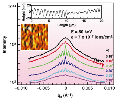 = 1.55 Å. Typical GID curves for a sample show the presence of satellite peaks on both sides of the main (220) Bragg peak (Figure 96). The appearance of satellite peaks confirms the existence of lateral undulation of the buried crystalline part of the sample. The separation between the satellite-peaks is inversely proportional to the subsurface crystalline ripple wavelength, which agrees well with the ripple-like structure on the top surface observed through AFM measurements. At a certain value of incident angle the shape of the curve changes from a narrow to a broad one, indicating the onset of defect formation.