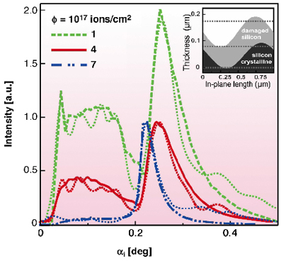 i scan curve turns into a Vineyard profile expected for a sample with a non-scattering (amorphous) top layer. The reconstructed depth profile obtained from the simulation of the Vineyard profile (dotted lines in Figure 97) shows that the material density of the subsurface layer is very low (about 15% of the crystalline Si bulk density); at the same time the rippled, modulated crystalline part underneath is damaged and has a reduced density. The partially crystalline top layer at low dose, transforms to a completely amorphous layer for high doses and the surface morphology was found to be conformal with the underlying crystalline ripples.