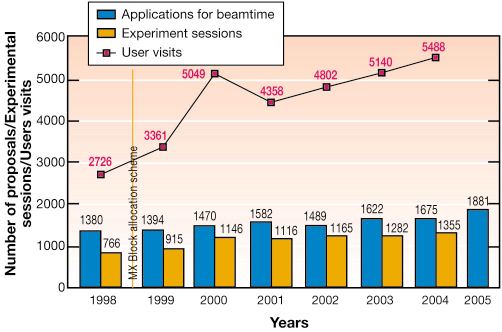 Fig. 169: Numbers of applications for beam time, experimental sessions and user visits, 1998 to 2005. N.B. Final numbers of experiments and user visits for 2005 were not available at the time of going to press. |