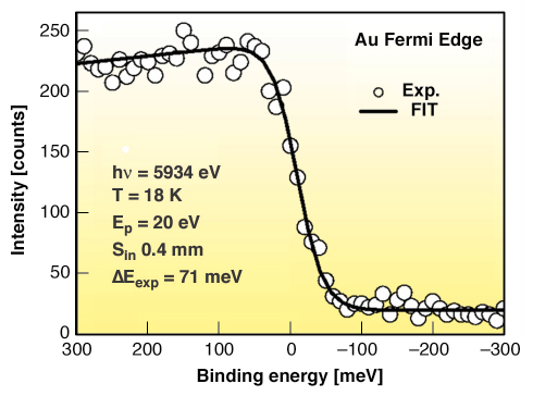 Fig. 12: Au Fermi level (circles) measured at hv = 5934 eV with pass energy Ep = 20 eV and analyser slits sin = 0.4 mm. The acquisition time was 150 minutes and the counts correspond to an integration over 8 mm of detector active area. The overall energy resolution, as obtained from the fit of the Fermi edge (solid line), is about 71 meV FWHM (50 meV photons + 50 meV analyser). |