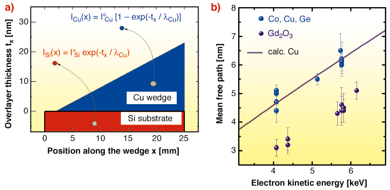 over the 4-6 keV range of electron kinetic energy Ek, using the so-called overlayer method (see Figure 13a), i.e., measuring the intensity of substrate and overlayer core level peaks vs. the overlayer thickness [3]. Experimental values of