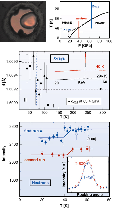 Fig. 38: (a) Single-crystal of D2 in helium; Phase diagram (b) and the P-T paths of the X-ray (c) and neutron measurements (d). The evolution of the 002 d-spacing (X-rays) and the intensity of the 010 reflection (neutrons) show the changes at the I-II phase transition upon cooling. |