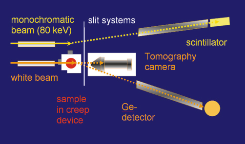 /ß-brass) and its correlation to texture and microstructure development was studied. Sample and experimental conditions were selected in such a way that the timescale of the creep process is much longer than the time required for collecting the microtomography data and the diffraction data. A novel miniature creep device was developed where the path of the incoming and the emerging X-rays over a complete 180° turn of the sample is identical. The experimental setup at beamline ID15A consisted of three detection systems, which allowed us to sequentially perform white beam tomography [2], energy-dispersive diffraction and angle-dispersive diffraction without further alignment or calibration procedures during the experiment (Figure 40).