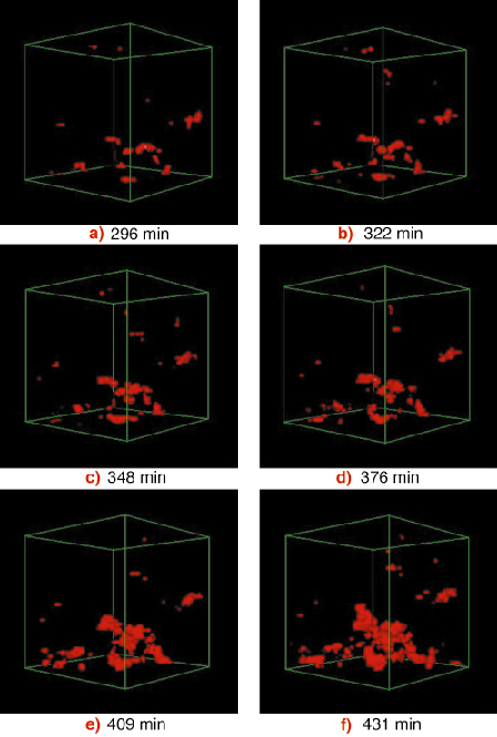 Fig. 41: Progression of the voids (red) with increasing creep time within a sample of CuZn40Pb2 brass. |