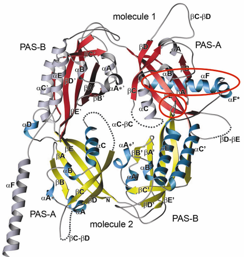 Fig. 79: Crystal structure of the Drosophila Period (dPER) dimer. Molecule1 is shown in red and grey, molecule2 in yellow and blue. PAS-A and PAS-B denote the two PAS domains in each monomer. The PAS-A dimer interfaces are highlighted by red circles. |