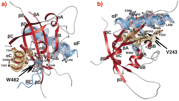 C). The crystal structure of the dPER PAS repeat region reveals a non-crystallographic dimer stabilised by two sets of intermolecular PAS domain interactions (Figure 79). The dimer interfaces are mediated by interactions of PAS-A with a conserved tryptophan residue, Trp482, in the ßD’-ßE’-loop of PAS-B (PAS-A-Trp interface, Figure 79 and Figure 80a) and with the helix