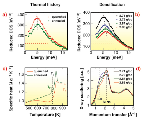 Fig. 5: Reduced density of vibrational states of glasses with (a) different thermal history and (b) different density. The horizontal lines show the calculated Debye levels. The black dashed lines emphasise the shift in the peak position. (c) Calorimetry data for the glasses with different thermal history. The vertical dashed line shows the glass transition temperature. The arrows indicate the corresponding fictive temperatures TF. (d) X-ray scattering data for the densified glasses. The dashed lines indicate the positions corresponding to the characteristic oxygen-oxygen and silicon-sodium atoms distances. |