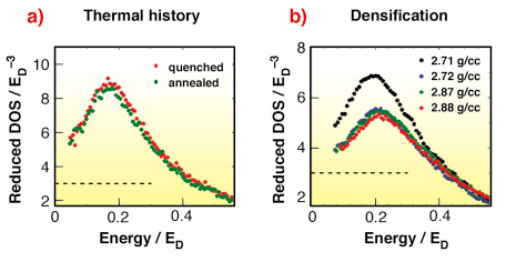 Fig. 6: Reduced density of vibrational states of glasses with (a) different thermal history and (b) different density after rescaling the energy axes in Debye energy units and the renormalisation of the DOS area. The horizontal lines show the Debye levels. |