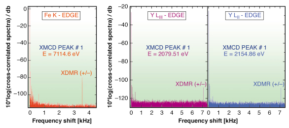 C2 can be obtained [1]. Since the microwave power was amplitude modulated at a low triggering frequency (i.e. fMW = 3.5504298 kHz at the Fe K-edge or fMW = 7.1008596 kHz at the Y L-edges), the XDMR signatures appear as modulation side-bands with respect to the macrobunch repetition frequency of the ESRF ring (F2 = 710.0859611 kHz in the 2*1/3 filling mode). The spectacular dynamic range of our detection system is illustrated by Figure 115 in which the XDMR signal peaks 34 dB (17 dB) above the noise floor at the Fe K-edge (Y L-edges) [3]. To further improve the sensitivity of our measurements, cross-correlated spectral densities of the two side-bands were exploited. Note that the experiments at the Y L-edges were challenging because the fluorescence intensity was typically 27 dB lower than at the Fe K-edge and the circular polarisation rates were also lower than at the Fe K-edge. For brevity, we have shown only a few typical XDMR spectra in Figure 115: these spectra were obtained on tuning the X-ray excitation energy to the first extremum of the XMCD spectrum.