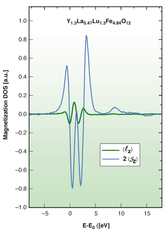 Fig. 116: Orbital and Spin magnetisation of d-projected DOS at the Y site in rare earth doped YIG film. Strictly the same generic spectrum was obtained for the undoped YIG film. |