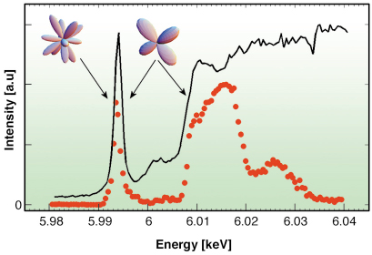 Polarisation analysis of RXS experiments has developed greatly in the last few years, helping our understanding of characteristic order parameters in transition metal oxides, rare-earth based compounds, and actinides. However, a full investigation of Pointcarè-Stokes’ parameters had never been carried out, most likely because linear polarisation analysis was considered sufficient. While linear polarisation analysis may be sufficient when just one excitation channel is involved, several dephasing phenomena may appear when two different excitations close in energy contribute to the transition. As described above, these phenomena may lead to a situation where a scattering process converts an incoming linear polarisation into a circular one due to an interference between two multipolar tensors. The use of phase plates and of a complete polarisation analysis is the key to disentangling multi-resonance structures in those situations where just an energy scan (see Figure 117) is not sufficient. This technique allows a sensitive determination of the relative strength of the multipoles involved and a deeper insight into complex phase transitions and ordering phenomena, being in turn a powerful tool to finely investigate electronic configurations of solid state materials.