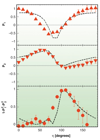 of the incoming linearly polarised beam. P3 (degree of right-left circularly polarised light) is not directly accessible in this setup. For fully polarised light P12+P22+P32 = 1, where -1 < Pi < 1, i = {1,2,3}. The polarisation analysis of the diffracted beam can resolve resonances determined by multipolar tensors of different order that are very close in energy, playing on their different relative phase shifts. Polarisation scans were performed at the pre-edge region of the Cr K-edge (E = 5994 eV) in K2CrO4. In this compound an electric quadrupole tensor (E1-E1 channel) and an electric hexadecapole tensor (E2-E2 channel) are responsible for the strong resonance in the (130) glide-plane forbidden reflection (Figure 117; cartoon pictures show the shape of the two tensors involved in the scattering while the black arrows indicate the energy ranges of the respective contributions). Figure 118 shows the measured results: we discovered a degree of linear polarisation very different from 1 in a wide angular range (bottom panel). Ab-initio calculation fit the data nicely (Figure 118, dashed lines), indicating that the missing linear polarisation is fully converted into a circular one. A “time reversed” experiment indeed confirmed that this was the case: by impinging on the sample with a circularly polarised beam we obtained a diffracted beam fully linearly polarised. Polarisation scans performed at the Cr K-edge energy (E = 6010 and 6018 eV), where only the E1-E1 channel is expected to contribute, detected a complete linearly polarised (P12+P22 = 1) scattered beam.