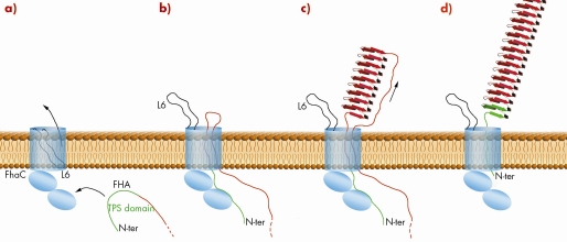 Targeting of proteins to their dedicated subcellular compartments is essential for cell function and organelle biogenesis. Translocation of proteins across, or insertion into membranes is mediated by protein machines, some of which have been conserved throughout evolution, such as the transporters of the Omp85/TpsB superfamily. TpsB transporters are components of “Two-Partner Secretion” (TPS) systems in Gram negative bacteria [1]. They secrete large, mostly ß-helical proteins called “TpsA” proteins that generally serve as virulence factors. TpsB transporters function as monomers and without accessory factors. The superfamily also includes the Toc75, Sam50/Tob55 and Omp85/YaeT homologs, which are the cores of large hetero-oligomeric complexes involved in protein transport across, and insertion of b-barrel proteins into, the outer membranes of chloroplasts, mitochondria and Gram-negative bacteria. In recent years, researchers have begun to make progress in understanding how these transporters work. The structure of FhaC, the outer-membrane transporter that secretes the Bordetella pertussis adhesin filamentous haemagglutinin (FHA) now provides structural insights into this process.