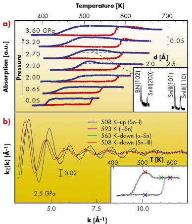 Fig. 103: a) Series of fixed-energy X-ray absorption temperature scans at different pressures. The drastic changes of the absorption during heating (red) and cooling (blue) ramps correspond to phase transitions. Above 2 GPa, undercooled Sn nucleates in a metastable phase, identified as solid Sn-III by X-ray diffraction (inset). b) XAS k |