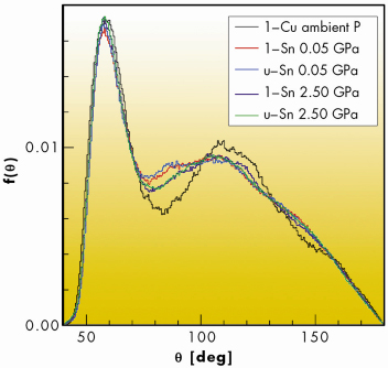Fig. 104: Angular distributions of liquid and undercooled Sn at 0.05 and 2.5 GPa, compared with liquid copper at ambient pressure. |