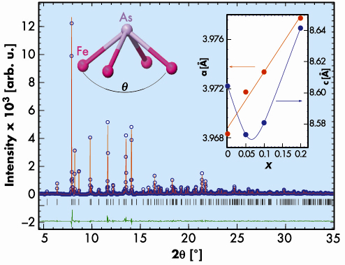 Recently, we have investigated the new family of hole-doped systems, Nd1–xSrxFeAsO (x = 0.05, 0.1, 0.2). Inspection of the room temperature diffraction profiles collected at beamline ID31 reveals the tetragonal unit cell (P4/nmm) established before for REFeAsO (Figure 39). Rietveld analysis shows that the a-axis increases monotonically with x as expected considering the larger ionic radius of Sr2+, while the c-axis initially contracts at small x before undergoing a considerable expansion at x > 0.1. The c-axis dimensions are influenced by the geometry of the AsFe4 pyramidal units with the Fe-As-Fe angle,
