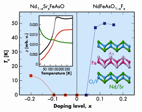 Fig. 40: Electronic phase diagram of electron/hole doped NdFeAsO. Blue (red) squares mark the superconducting transition temperatures for electron (hole) doping. Inset: schematic diagram of the tetragonal structure of Sr2+ and F– doped NdFeAsO and temperature dependence of the resistivity for Nd1–xSrxFeAsO [x = 0 (black), x = 0.05 (green), x = 0.2 (red)]. |
