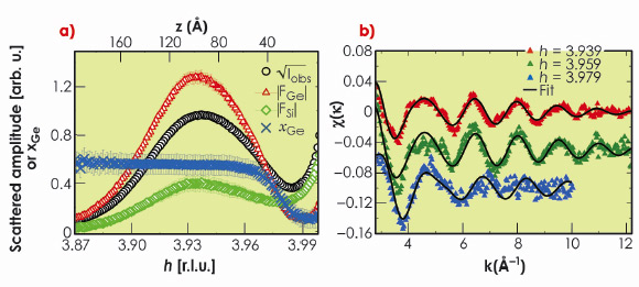 c = 0.163° at 11 keV). Figure 36a shows the square root of the scattered intensity at 11053 eV (Iobs), the modulus of the Ge and Si structure factors, as well as the Ge content (xGe), as a function of the reciprocal lattice index h and height (z) above the Si surface (h can be associated with different heights z in the nano-islands, according to the iso-strain method). MAD results clearly show a strong Si/Ge intermixing, the Ge content is about 0.6, together with a slight linear increase of xGe starting above z = 4 nm. Figure 36b shows background-subtracted extended DAFS spectra together with the best-fit curves. The three experimental EDAFS spectra were recorded in grazing-incidence geometry, close to the in-plane Si 440 Bragg reflection, at h = 3.939, 3.959, and 3.979, corresponding to z = 3 nm, 6 nm and 9 nm, respectively. The fits show that the Ge content increases slightly from the base to top of the dome (xGe = 0.54 and 0.6 at h = 3.959 and 3.939, respectively). The EDAFS results are in very good agreement with MAD results, except near the Si Bragg peak corresponding to the substrate-island interface region (h = 3.979). Interestingly, in this region, the Ge content obtained from MAD (xGe ~ 0.2) is lower than that obtained from EDAFS (xGe = 0.55). MD simulations clearly show (Figure 37) that in the case of an island-substrate interface with a sharp change in GeSi composition, information is lost, and an artificially smooth gradient is found by MAD owing to the scattering contribution of the strained Si substrate region beneath the islands (Figure 37a). In contrast EDAFS oscillations are much less sensitive to the presence of the interface (Figure 37c), since EDAFS spectroscopy probes only the Ge local environment. Therefore, there was no evidence for the presence of a Si-rich core below 4-5 nm in the nano-islands that we have studied, as suggested by others.