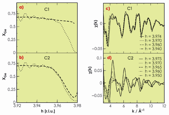 Fig. 37: Molecular dynamics simulations. MAD and extended DAFS of SiGe/Si(100) islands (aspect ratio equal to 0.16, about 20x106 atoms). Ge concentration (---) corresponding to a sharp (a, model C1) and smooth (b, model C2) composition gradient and Ge concentration (…) extracted back from the simulated MAD. An artificial composition gradient is found in the case of model C1 (c)-(d) Extended DAFS |