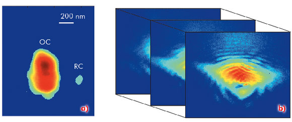 Fig. 26: a) The holographic sample: object (OC) and reference crystal (RC). b) 2D slices through the 3D coherent Bragg diffraction intensity distribution. |
