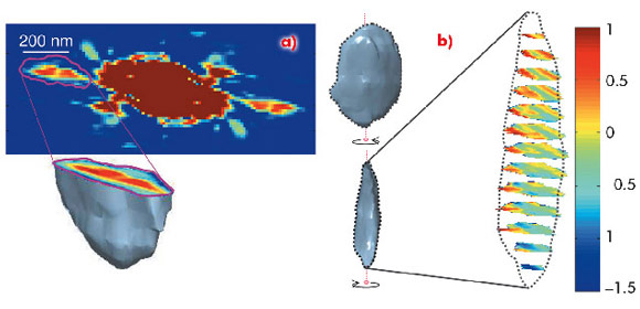 Fig. 27: a) The inverse Fourier transform of the 3D intensity distribution. b) Two views of the external shape and the internal phase distribution (colour scale in radians). |