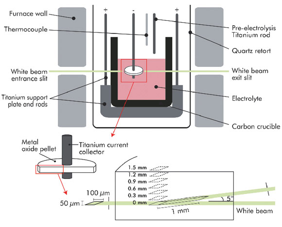 This discovery has encouraged a broader exploration of electrochemical reduction as a competitive extraction route, which has the potential to replace current commercial extraction routes for elements like Ti, Ta, Zr, etc. Whilst reducing these metal oxides to metal is relatively simple, doing it consistently to form a product with low concentrations of impurities in an efficient way has proven to be more challenging. To achieve these goals, it is important to understand fundamentally the reactions taking place, so that it becomes possible to control the process. Unfortunately high temperature electrochemical studies (as shown in Figure 44), do not lend themselves to conventional analysis techniques.