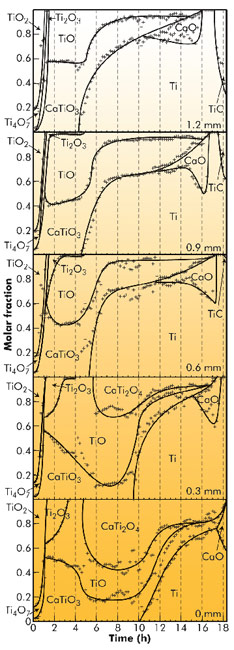 In 2008, the authors proposed an experiment at ID15A where the phase evolution during the FFC Cambridge reduction of titanium dioxide to titanium metal could be logged in situ. The experiment would require a redesign of the classic FFC cell to make it X-ray transparent whilst being capable of completing an eighteen hour FFC Cambridge reduction. The diffraction patterns were analysed using Rietveld refinement and volume fraction and phase information was extracted, resulting in the phase map shown in Figure 45.