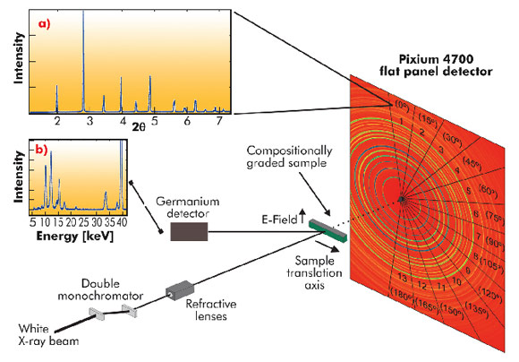 High-energy X-ray scattering experiments were carried out at beamlines ID15A and ID15B. A schematic of the experimental setup for ID15A is shown in Figure 46, where a beam energy of 75.3 keV was selected by a double bent Laue monochromator. Refractive lenses were used to focus the beam to approximately 45 x 45 µm2 at the sample. The sample was placed inside an electric field chamber that was translatable in the direction parallel to the compositional gradient. X-ray diffraction images were collected in transmission using a large area detector. With this setup it was possible to measure the sample composition using quantitative X-ray fluorescence and simultaneously obtain the structure of the materials as a function of the applied electric-field strength.