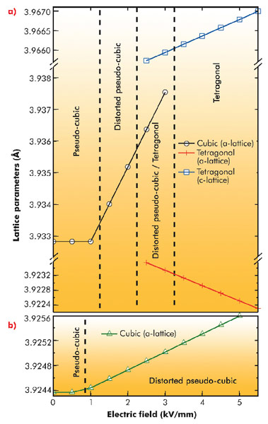 It was shown that samples in the range from 0.93(Bi0.5Na0.5)TiO3–0.07BaTiO3 to 0.86(Bi0.5Na0.5)TiO3–0.14(K0.5Na0.5)NbO3 underwent quite different mechanisms of electric-field-induced strains (Figure 47). Macroscopic property measurements are unable to distinguish between competing mechanisms at the atomic and microstructural scales. Here, however, we demonstrated that within this compositional range a variety of electrostrictive, phase transformation, domain switching, and piezoelectric strain mechanisms were active. Depending on the final application, such mechanisms either have a positive or negative effect on the quality of the product, thus rapid characterisation such as this is an invaluable tool in the identification of useful materials.