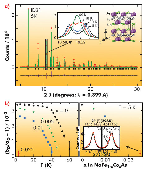 Fig. 50: a) Refinement of the structure of NaFe0.995Co0.005As against ID31 data at 5 K. The thermal evolution of the splitting of the tetragonal 112 reflection into the orthorhombic 022/202 is shown. b) The evolution of the distortion is shown for several compositions. For x = 0.025, which lies well into the superconducting (SC) region, there is no resolvable orthorhombic distortion, although slight broadening of the tetragonal 212 reflection is evident on cooling from 298 K to 5 K. aO and bO are the orthorhombic lattice parameters. |