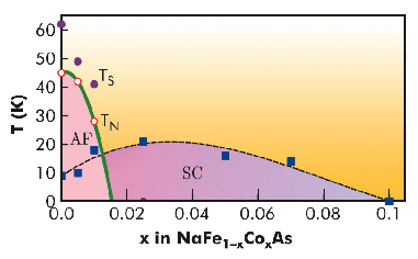 Fig. 51: Phase diagram for Co-doped NaFeAs. The magnetic ordering temperatures (TN) in the antiferromagnetic (AF) region were determined from muon spin rotation experiments. The structural distortion temperatures were determined from the measurements on ID31. |