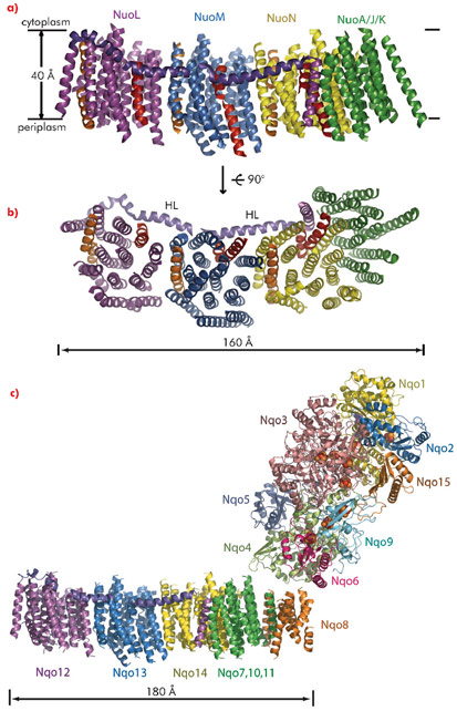 The complete structure of complex I at atomic resolution is currently unknown. Our earlier crystal structures of the hydrophilic domain of complex I from Thermus thermophilus established the electron transfer pathway from NADH through flavin mononucleotide (FMN) and seven iron-sulphur (Fe-S) clusters to the likely quinone binding site at the interface with the membrane domain. The three largest hydrophobic subunits of complex I, NuoL/Nqo12, NuoM/Nqo13 and NuoN/Nqo14 (Escherichia coli/T. thermophilus nomenclature), are homologous to each other and to the Mrp antiporter family, and so are likely to participate in proton translocation.